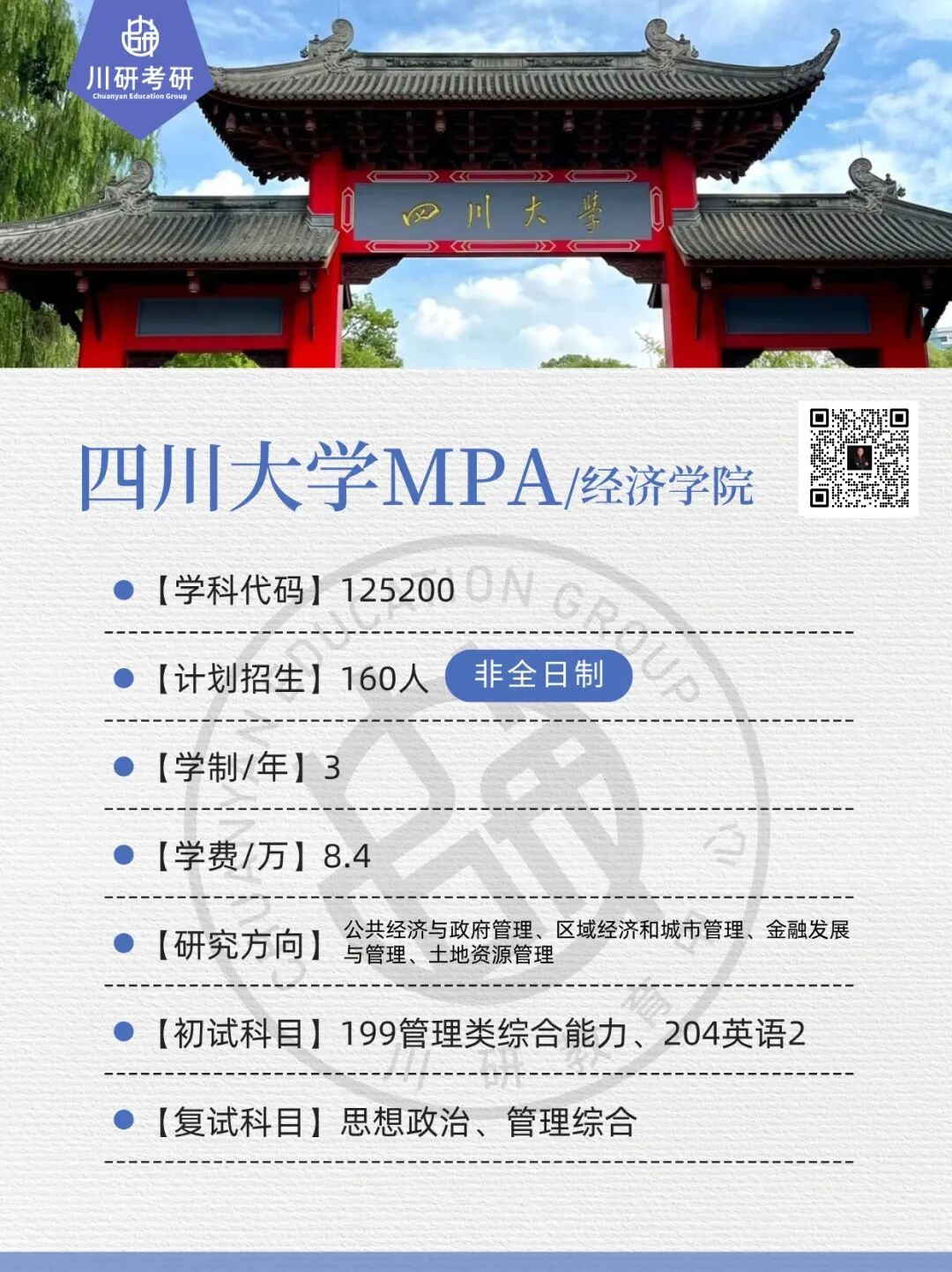 四川大学经济学院2026年非全MPA公共管理计划招生160人,学制3年,学费8.4万元,覆盖公共经济与政府管理、区域经济和城市管理、金融发展与管理、土地资源管理四个研究方向。