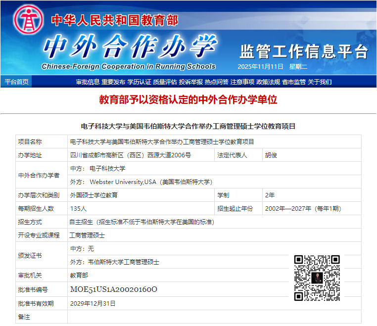 电子科技大学与美国韦伯斯特大学合作举办工商管理硕士项目(iMBA)是2002年经中华人民共和国教育部正式批准的中外合作办学项目该项目由电子科技大学经济与管理学院具体执行